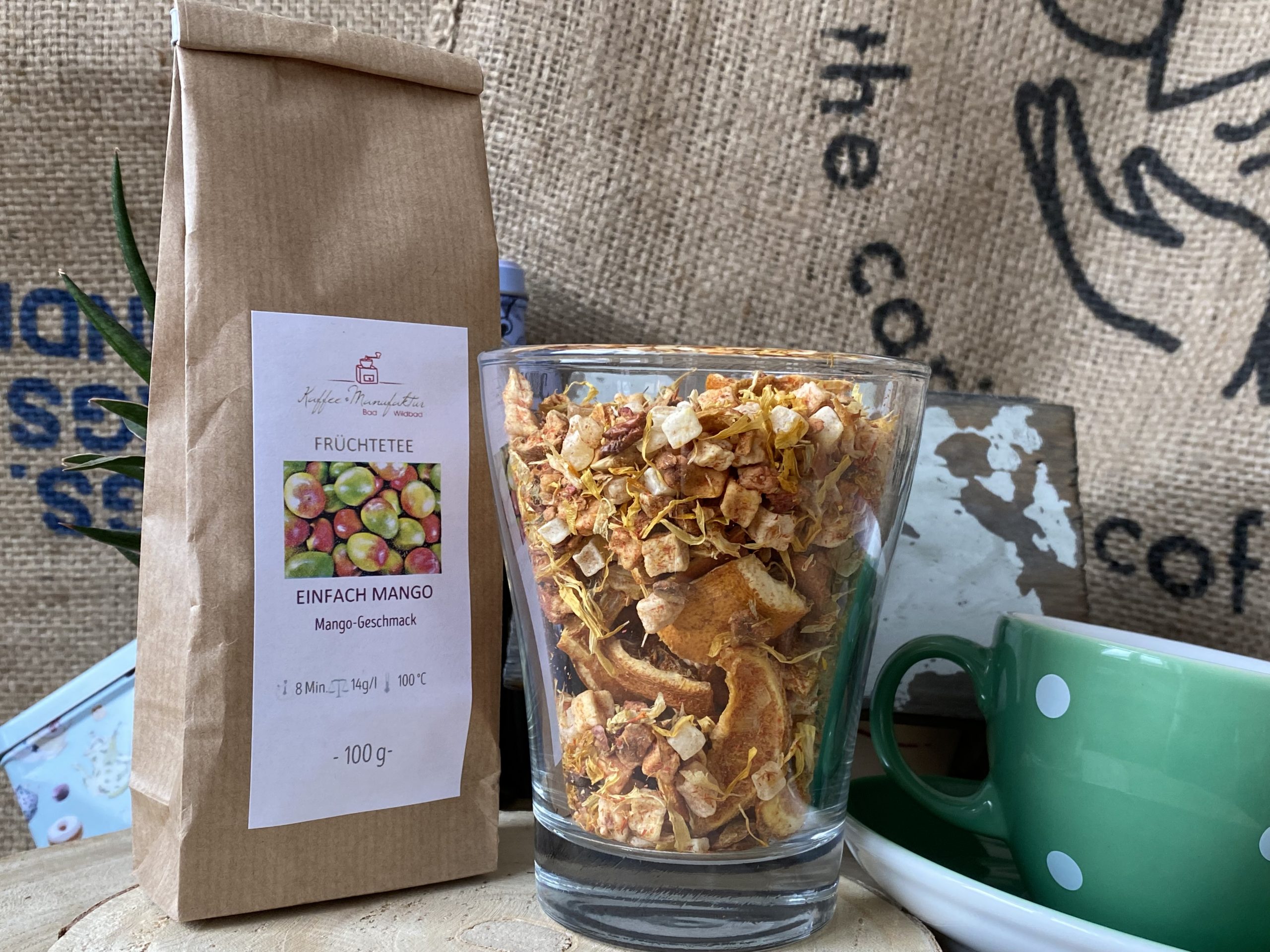 Inhalt: Mangostücke (Mango, Rohrzucker, Zitronensäure (E330) 24%, Ananasstücke (Ananas, Zucker, Zitronensäure (E330), Apfelstücke weiß (Apfel, Zitronensäure (E330), Orangenecken, Erdbeerstücke gefr. getr. Saflorblüten, Ringelblumenblätter, natürliches Aroma.