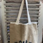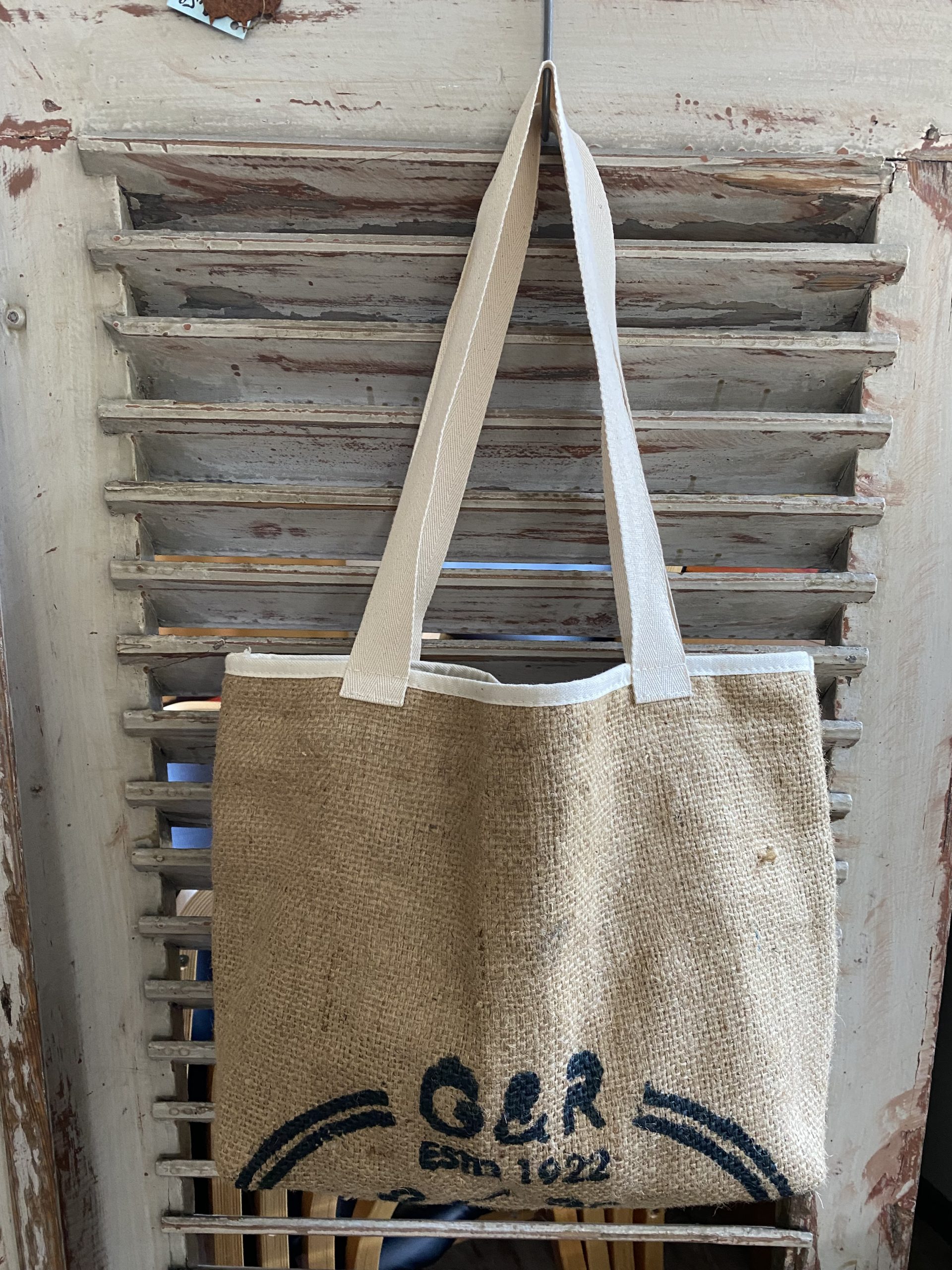 Handwerklich gefertigte Tasche aus robustem belastbaren Kaffeesack mit schönem Innenbezug und Lederträgern.
